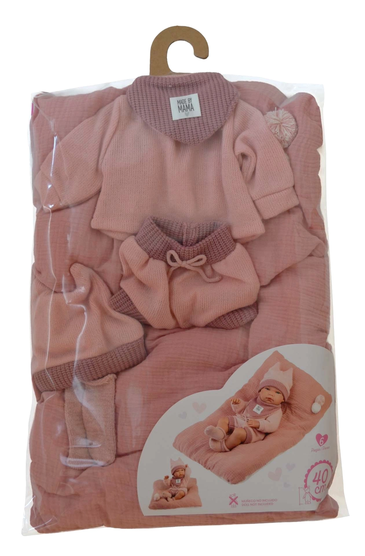 Štiri usklajene kose oblačil dopolnjuje okrasen vzglavnik/podloga, ki polepša posteljico in igralni kotiček za lutko.