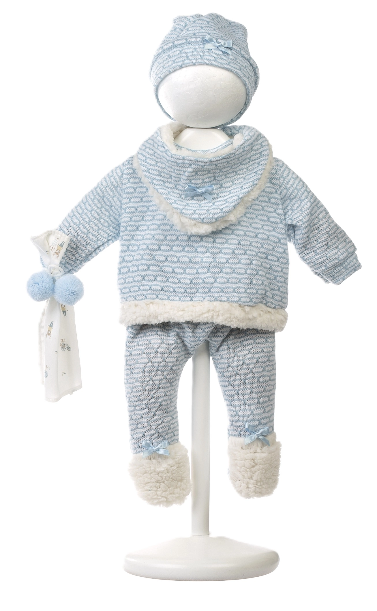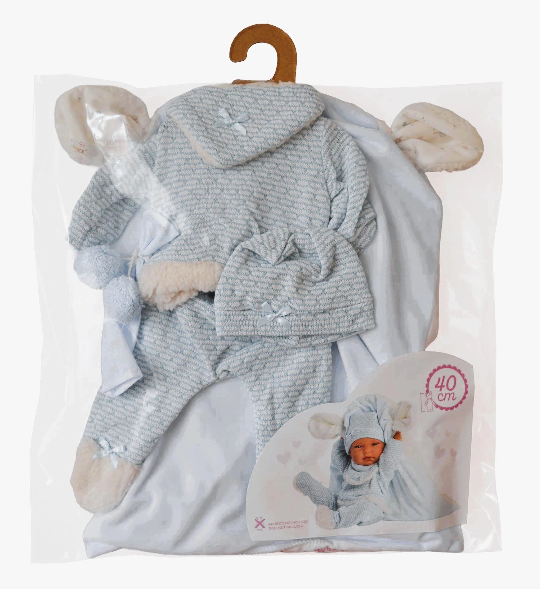 Stilski 5-delni set oblačil za punčke velikosti 40–42 cm prinaša vse, kar male varuške potrebujejo. Vsebuje mehke kose v ujemajočih se barvah, praktične dodatke in prijeten crkljivec. Ročno izdelano v Španiji za kakovostno izdelavo, mehke materiale in udobno oblačenje. Idealno za domiselno igro in skrb za dojenčka od 3. leta naprej.
