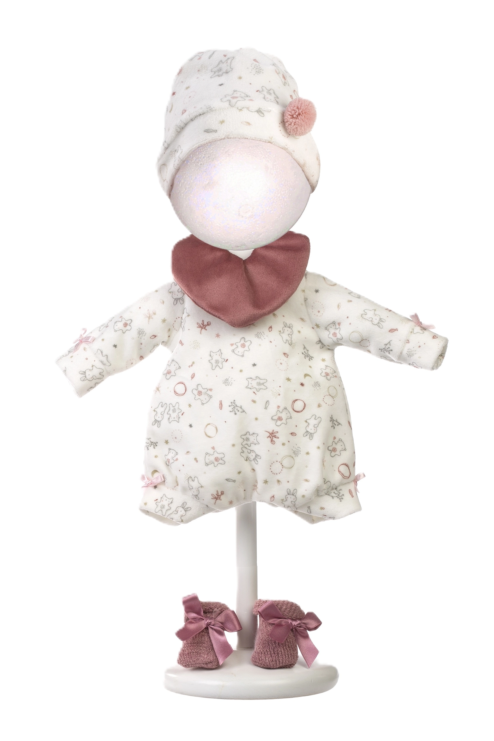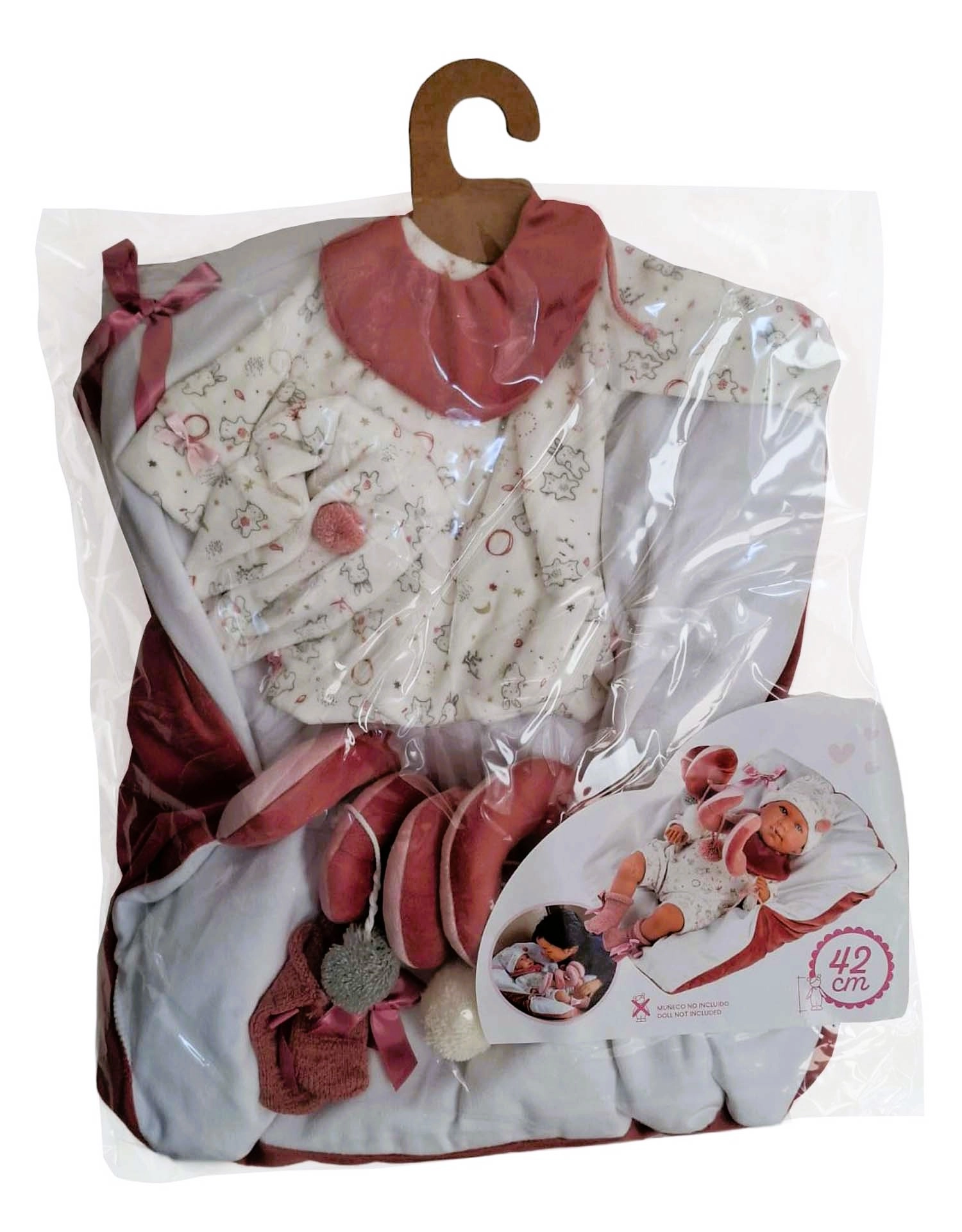 Komplet vključuje usklajeno oblačilo, žametni slinček in mehko podlogo, zato ima vaša punčka vse za vsakodnevno nego in udoben počitek.