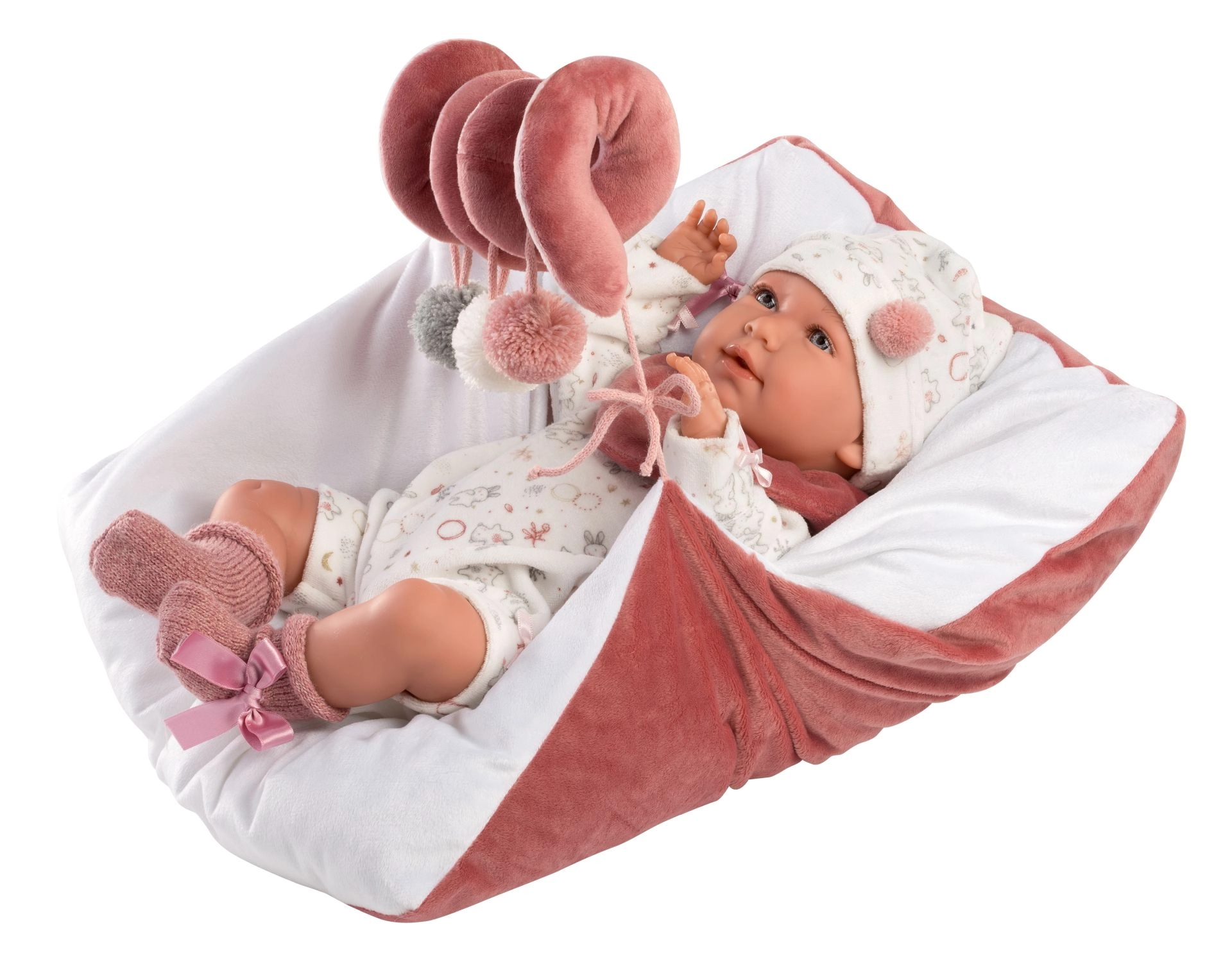 Viseči plišasti elementi na spirali zabavajo otroka, spodbujajo razvoj motorike in ustvarjajo prijetno okolje pri igri s punčko.