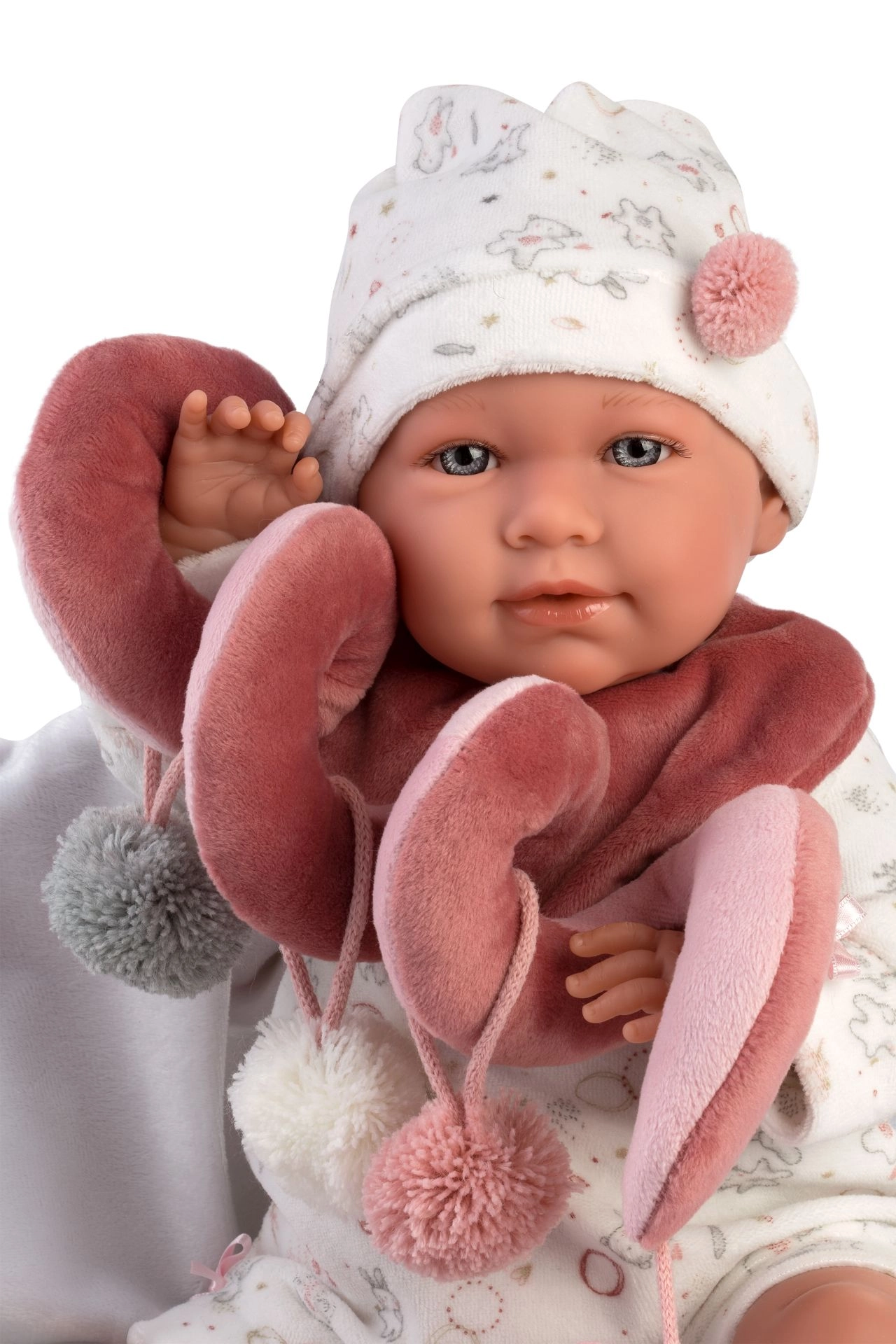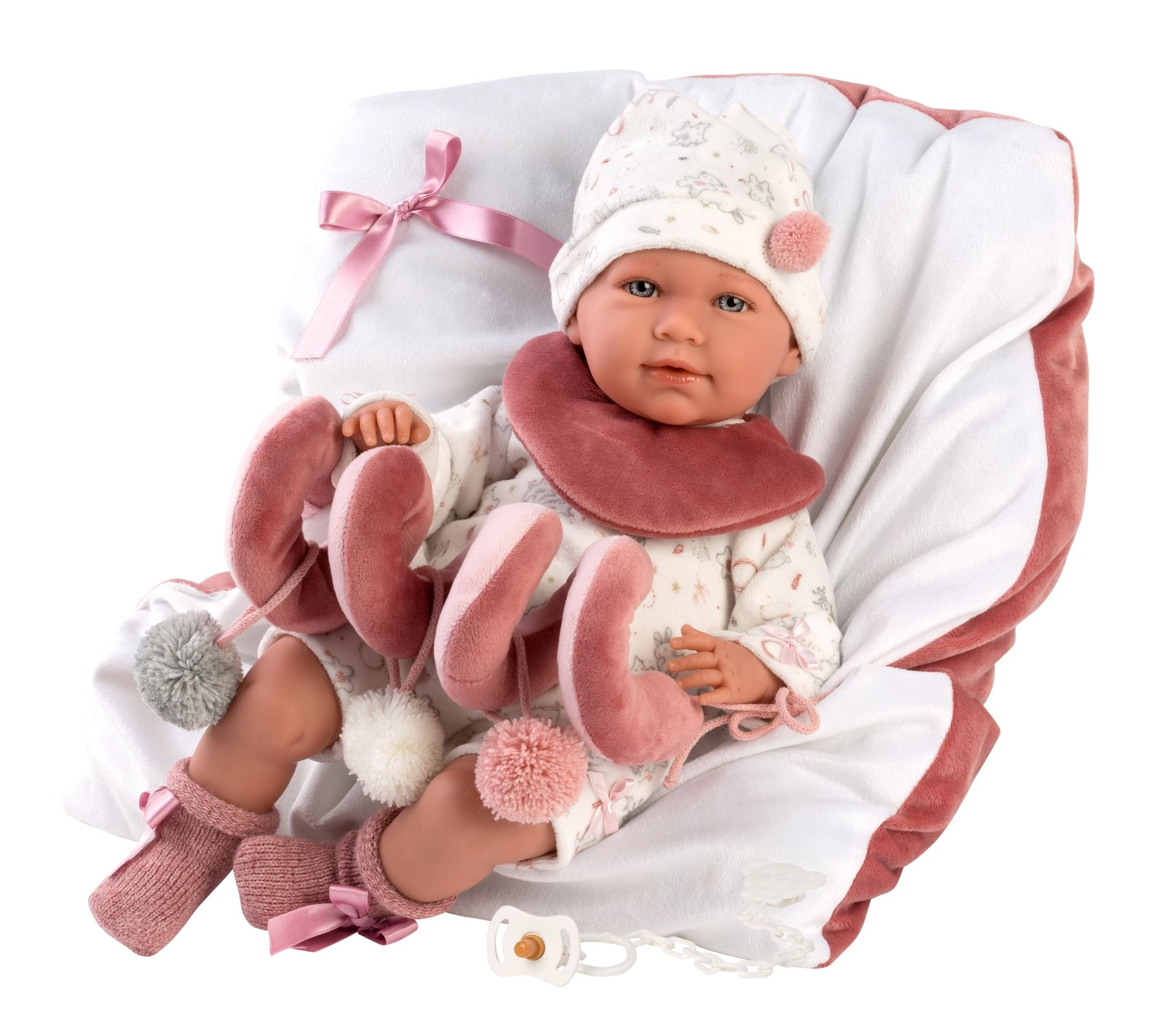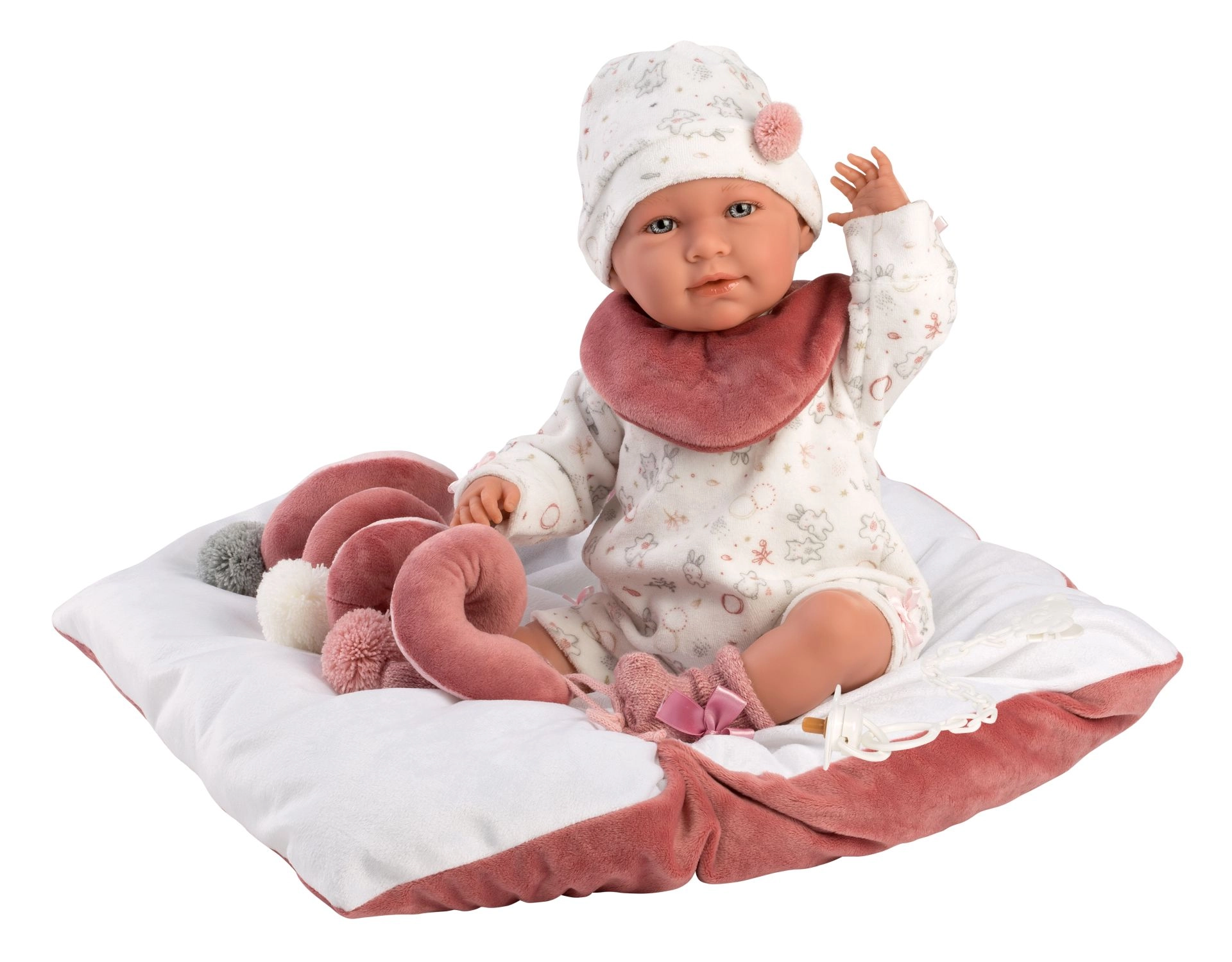 - Bogati dodatki: 2 dela oblačil, žametni slinček, mehka podloga s spiralno igračo