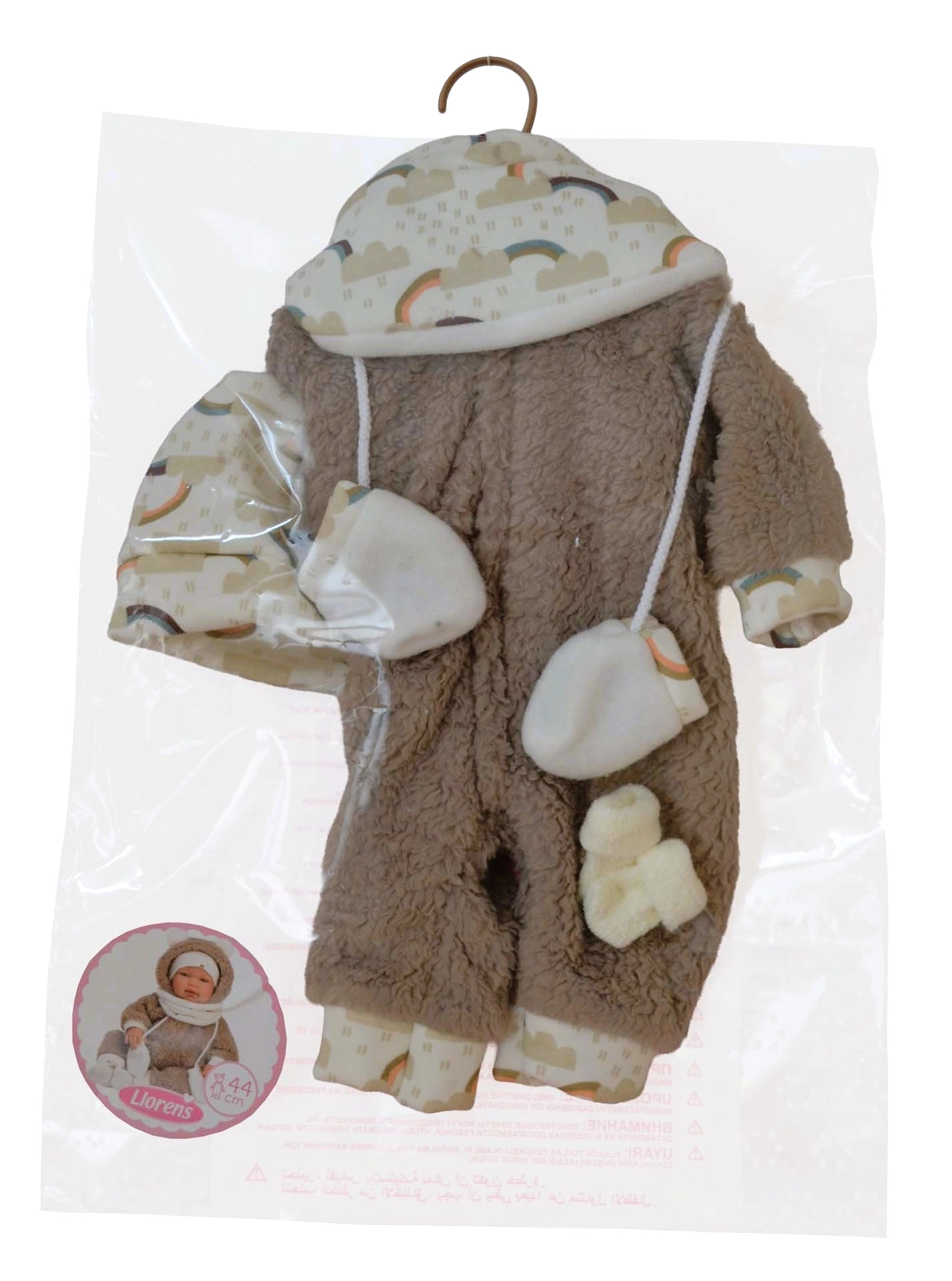 Sodoben komplet za punčke New Born blagovne znamke Llorens vsebuje 5 delov za enostavno kombiniranje in preoblačenje. Oblačila so ročno izdelana v Španiji, primerna za punčke velikosti 43–45 cm in navdušijo s kakovostno izdelavo ter dovršenimi kroji. Praktično pakiranje z obešalnikom olajša shranjevanje. Primerno za otroke od 3 let.