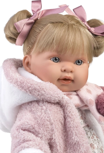 Rožnat puhast plašček z belim robom in dodatek s cofki punčki pričarata ljubek zimski videz, ki izstopa pri vsaki igri.