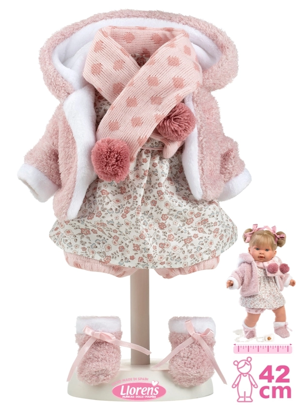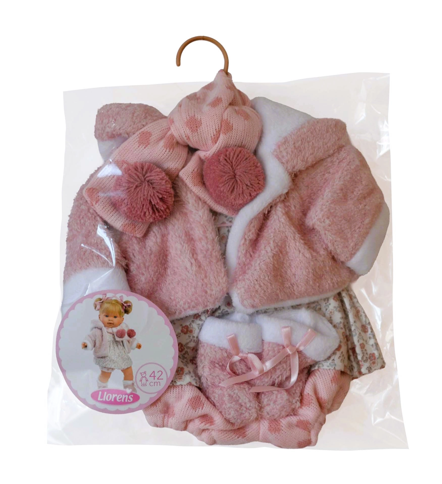 Slogovni set za punčke LLORENS v velikosti 42 cm bo navdušil vsako malo navihanko. Vsebuje 5 skrbno usklajenih kosov iz mehkih tkanin – rožnat puhast plašček z belim robom, kapo/šal z cofki, rokavičke in cvetlične oblekice s hlačkami. Oblačila so ročno izdelana v Španiji in dobavljena v priročni embalaži z obešalnikom. Odlično za igro domišljije in razvoj fine motorike. Primerno od 3 let.