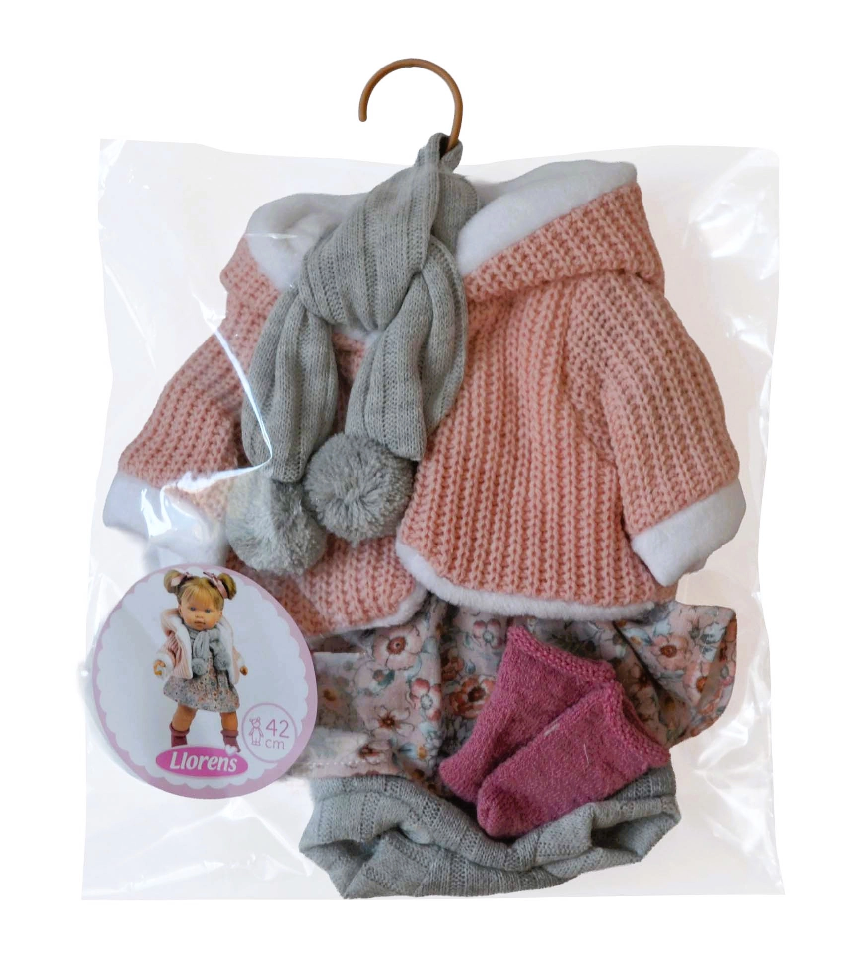 Stilni 5-delni komplet oblačil za punčke velikosti 42 cm prinaša popolno kombinacijo udobja in elegance. V njem najdete rožnato pleteno jopico s kapuco, siv šal z bunkicami, cvetlično krilo, sive kratke hlače in rožnate nogavice. Komplet je ročno izdelan v Španiji, skrbno dodelan in idealen za razvoj domišljije ter spretnosti pri preoblačenju punčk.