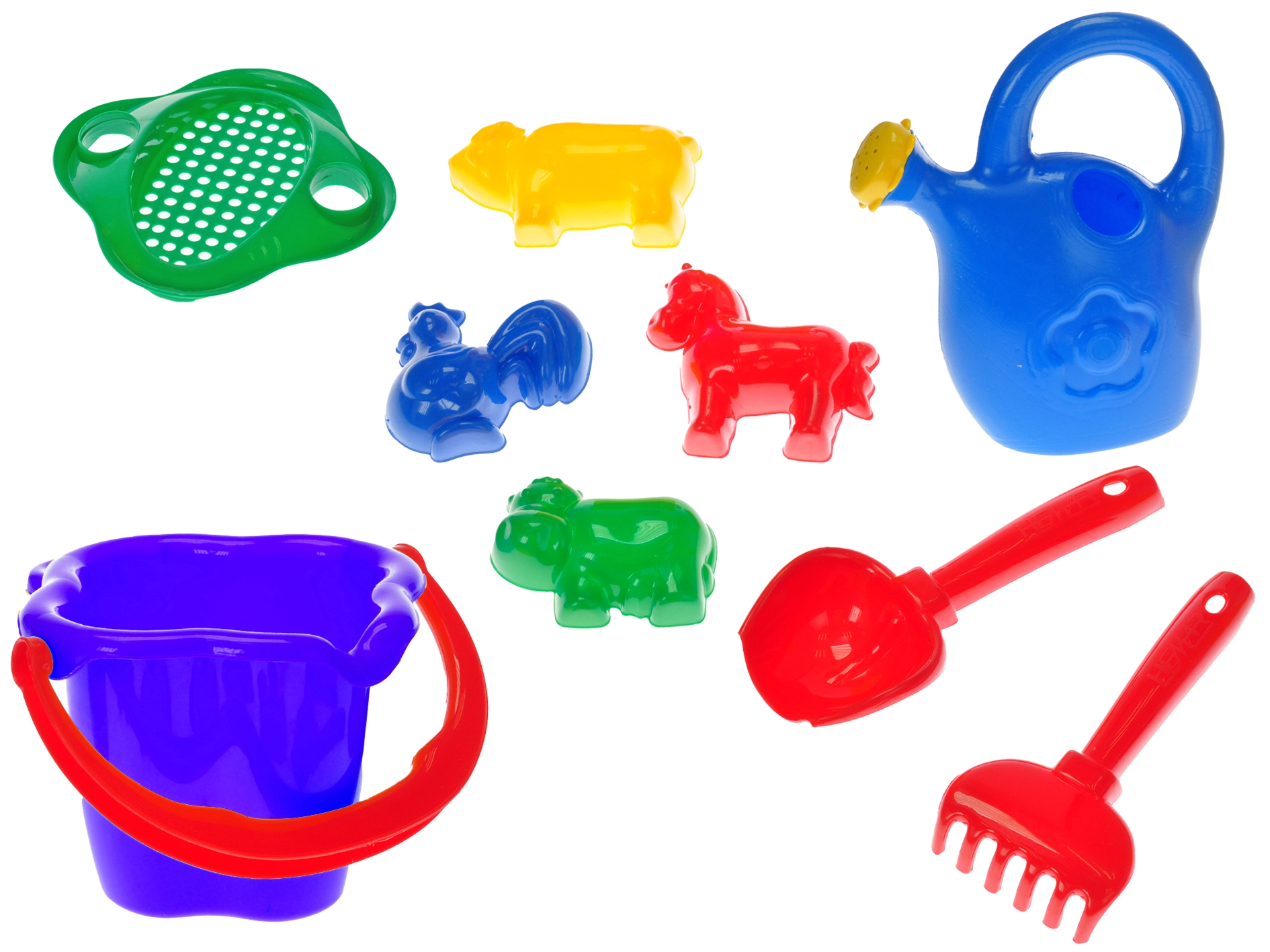 Vedro s sitom, kanglica, lopatka, grabljice in modelčki živalic – popolna oprema za gradnjo gradov, sejanje peska in zalivanje.
