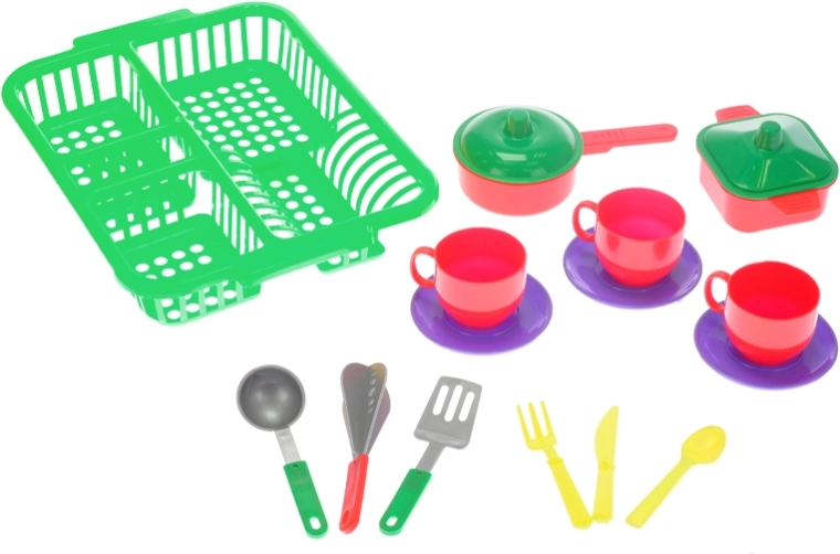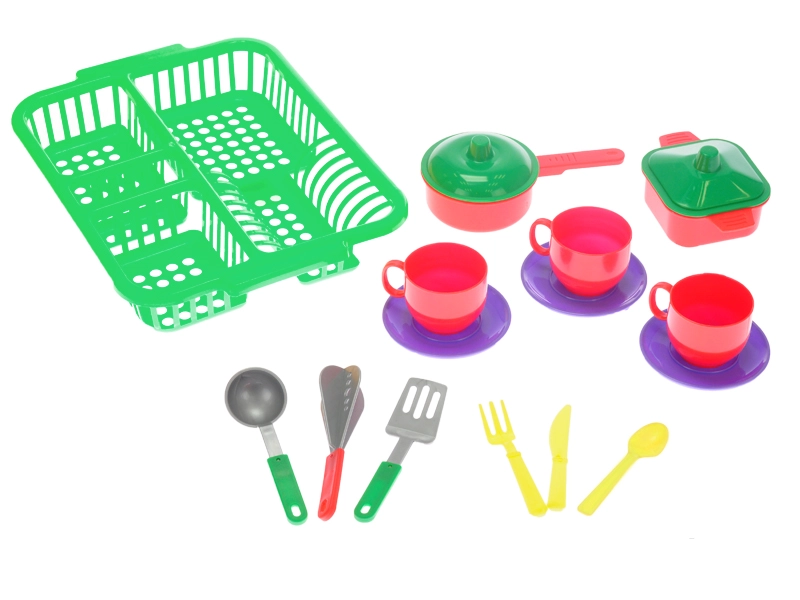 Ta otroški komplet posode s praktičnim odcejalnikom ponuja vse, kar je potrebno za igro kuhanja in pospravljanja v kuhinjici. Zahvaljujoč trem barvnim različicam je igra še bolj raznolika, otroci pa si zlahka ustvarijo lastne kuhinjske rituale.