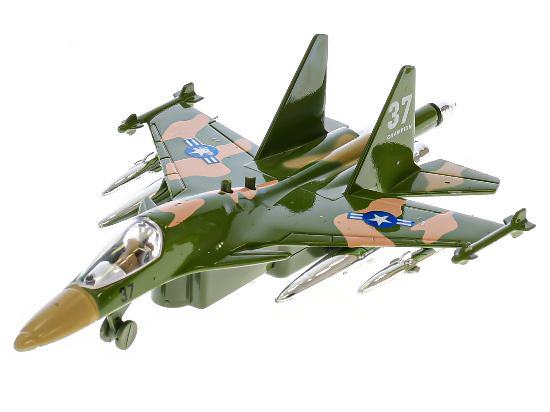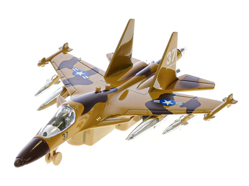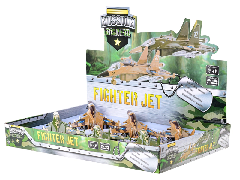 To podrobno izdelano vojaško letalo je idealno za male ljubitelje letalstva. Dovolj je naviti, spustiti in zaradi vzvratnega gibanja se požene kot pravi stroj. Ob pritisku na gumb letalo utripa in predvaja zvok zagona, kar še okrepi doživetje igre.