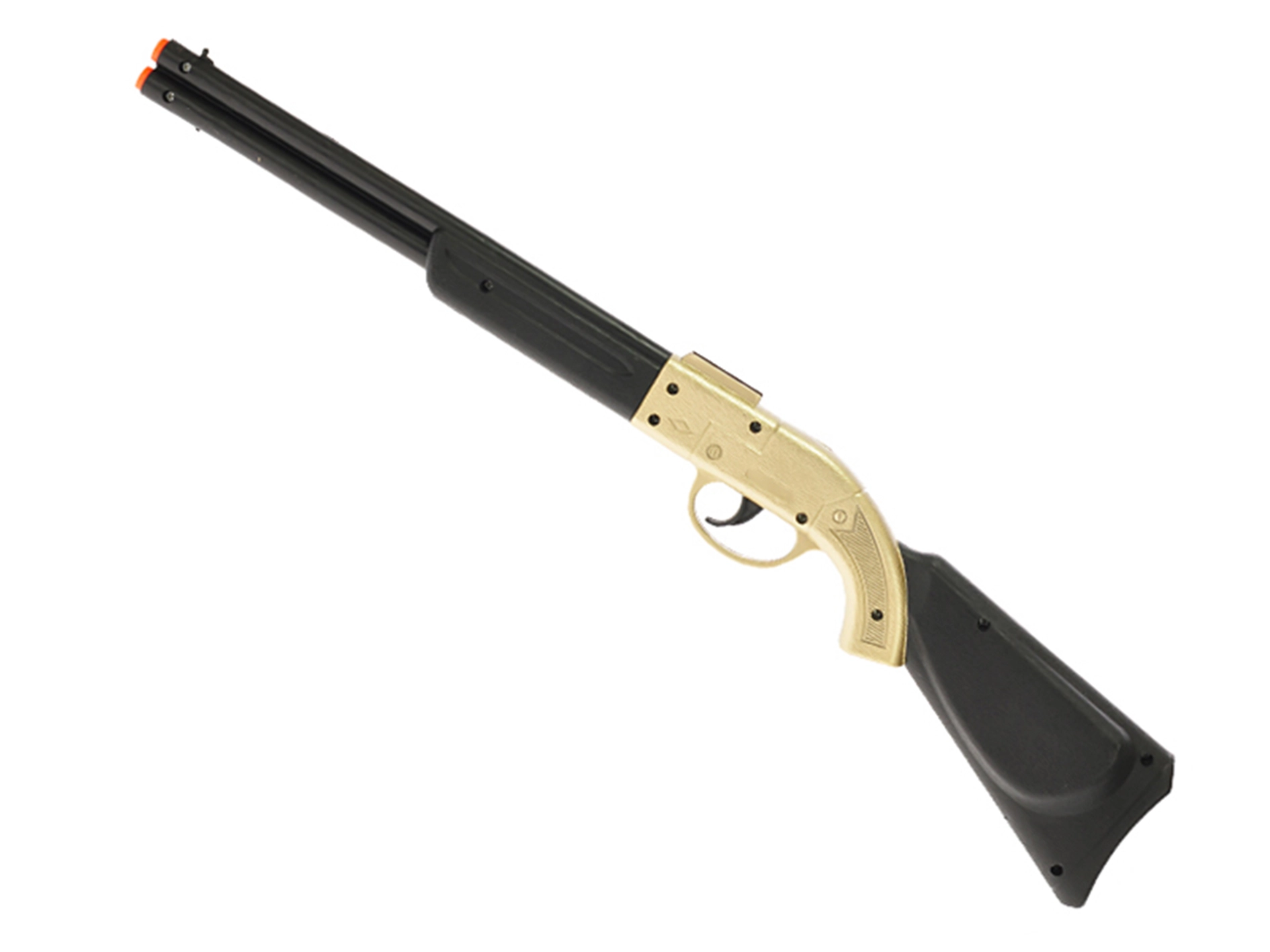 Zabavna kavbojska klapajoča puška dolžine 50 cm v privlačni zlati izvedbi bo navdušila vse male pustolovce. Zahvaljujoč realistični zasnovi, klapajočemu zvoku ob pritisku na sprožilec in lahki plastični konstrukciji spodbuja otroško domišljijo ter ponuja ure varne zabave že od 3. leta dalje.