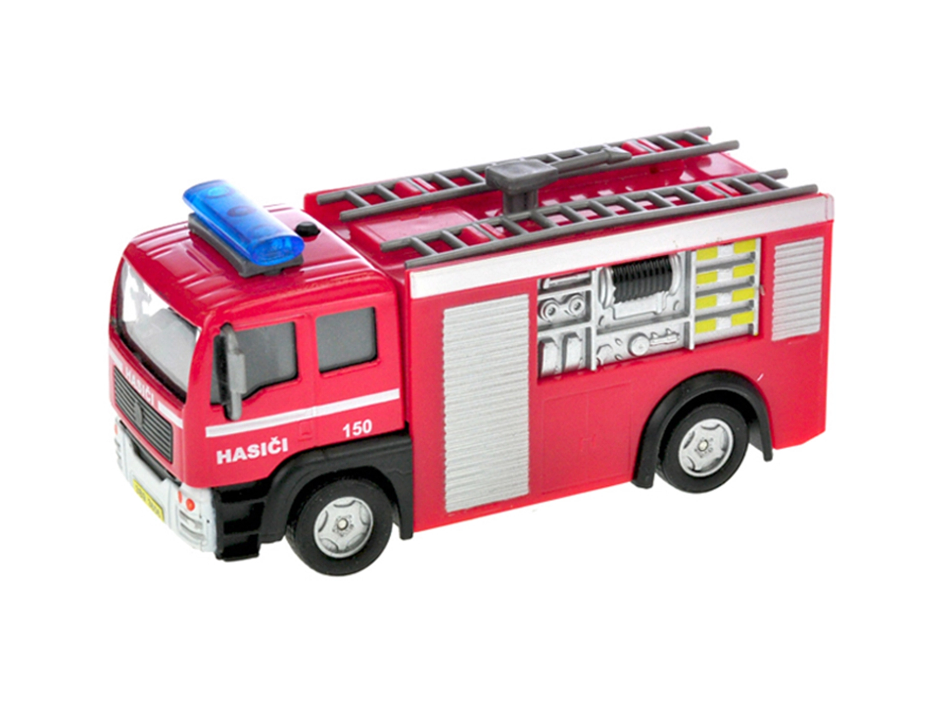 Realistični intervencijski gasilski avto dolžine 12 cm bo navdušil vsakega malega reševalca. Ko ga potegnete nazaj, se sam požene naprej zahvaljujoč sistemu vzvratnega pogona, dopolnjenemu s češkimi opozorilnimi sporočili in svetlobnimi učinki. Na karoseriji ne manjka niti telefonska številka 150, ki otroke uči pravilnega klica na pomoč.