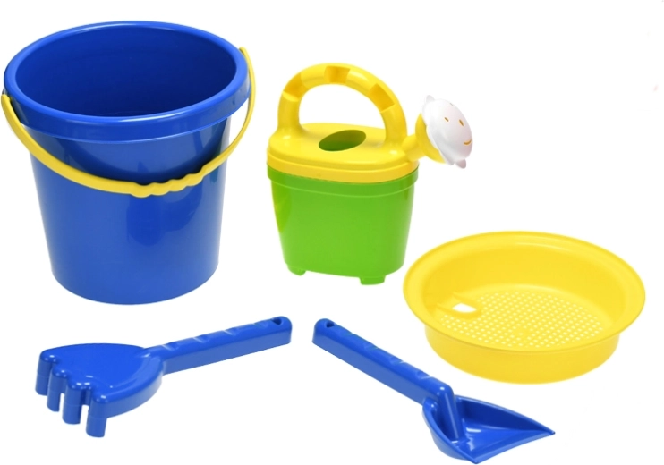 Vedro 17 cm, zalivalka 16 cm, sito, lopatka in grabljice – vse, kar otroci potrebujejo za gradnjo gradov in prelivanje vode na plaži in v peskovniku.