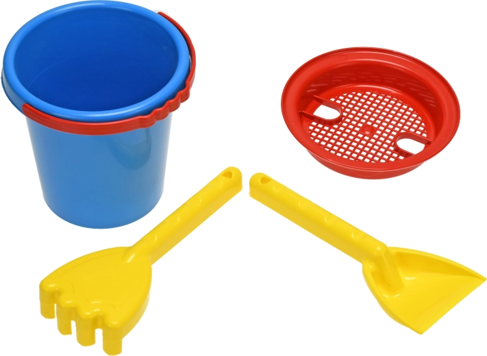 Barvit otroški komplet za pesek za najmlajše vključuje vedro, sito, lopatko in grabljice. Lahka in varna plastična zasnova je idealna za peskovnik in plažo, enostavna za čiščenje, igrače pa se zaradi živih barv ne izgubijo zlahka. Primerno za otroke od 10 mesecev.
