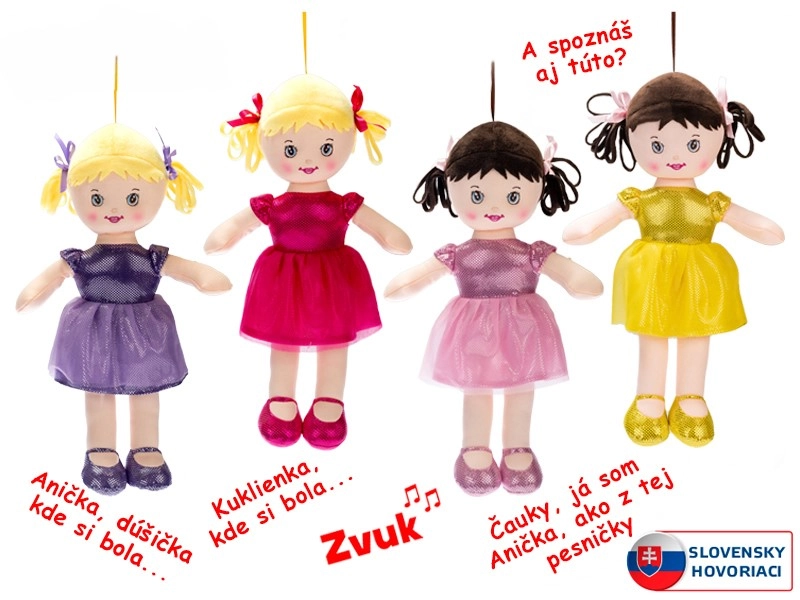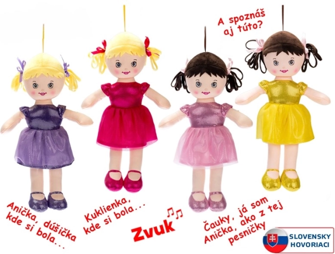 Ljubka plišasta punčka Anička višine 32 cm bo razveselila vsako malo princesko. Ima mehko telo, pisano oblekico in čeveljčke ter zna govoriti in peti v slovenščini. Zahvaljujoč prijetnemu materialu je idealna za crkljanje in igro ter razvija domišljijo in čustvene spretnosti otrok.