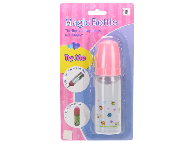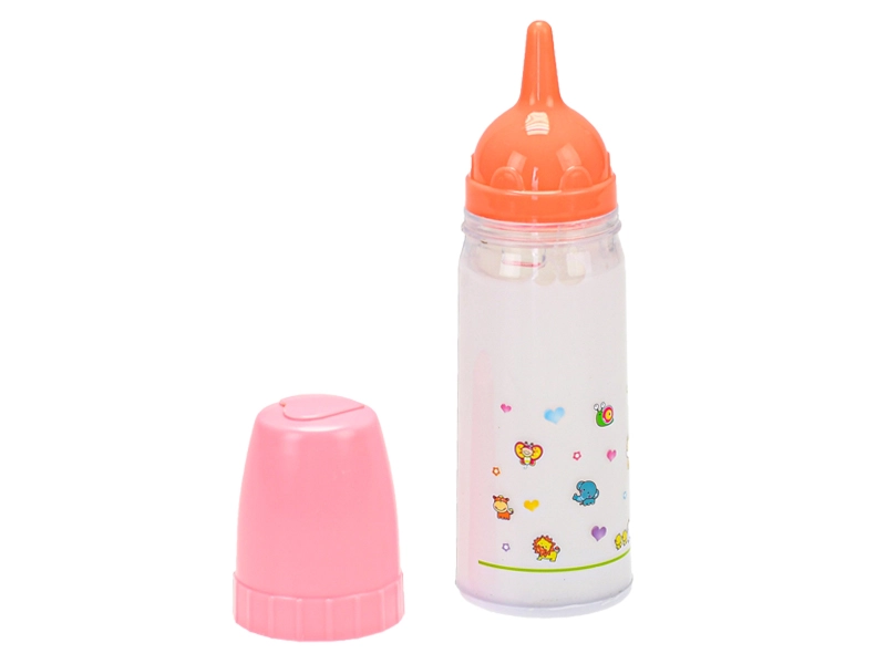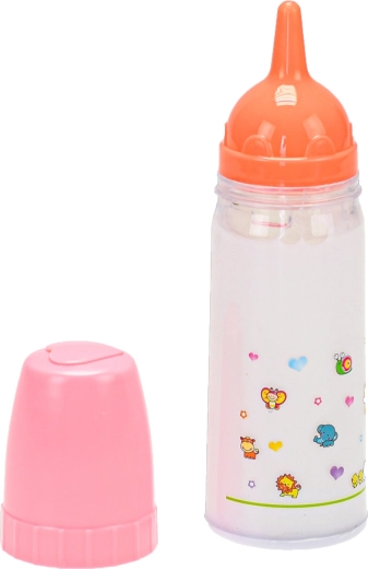 Realistična otroška steklenička za mleko za punčke dolžine 15 cm s tekočino, ki ob nagibu “izgine” in se po poravnanju vrne nazaj. Trpežen plastičen material, enostaven oprijem tudi za najmlajše in odlična pripomoček za razvoj domišljije in socialnih veščin.