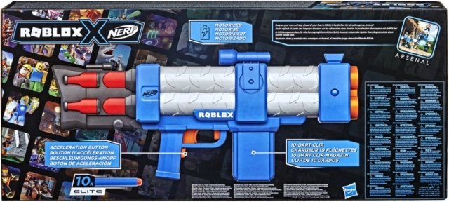 Potopite se v svet igre Roblox z blastrjem Nerf Roblox Arsenal: Pulse Laser! Ta blaster je navdihnjen z igro Roblox Arsenal in vam omogoča, da s priloženo kodo pridobite poseben virtualni predmet.
