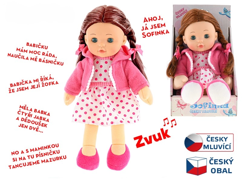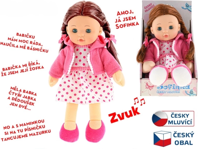Punčka Sofinka je idealna spremljevalka za otroke od 3 let dalje. Njeno mehko telesce je prijetno na dotik in vabi k crkljanju, medtem ko realističen videz z rjavimi lasmi in mežikajočimi očmi spodbuja otroško domišljijo. Sofinka poleg tega govori češko, kar na zabaven način razvija komunikacijo in empatijo.