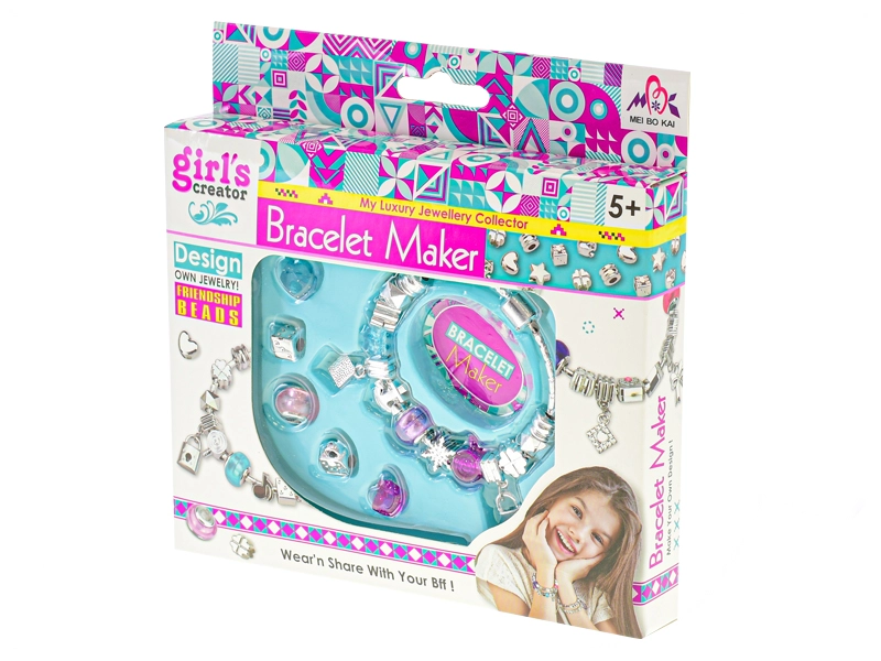Kreativni komplet vsebuje trpežno plastično zapestnico ter različne obeske in perlice z velikimi odprtinami za udobno nizanje. Otroci si lahko v trenutku sestavijo lastno barvno kombinacijo in prilagodijo videz nakita oblačilu ali razpoloženju.