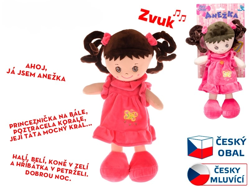 Punčka Anežka bo najmlajše razveselila z nežno izdelavo in pomirjujočimi češkimi melodijami. Recitira pesmico »Princeznička na bále« in poje uspavanko »Halí, belí«, s čimer spodbuja razvoj govora, glasbenega zaznavanja ter krepi odnos do češkega jezika. Zaradi mehke tekstilne zasnove je varna, lahka in žametna na dotik.
