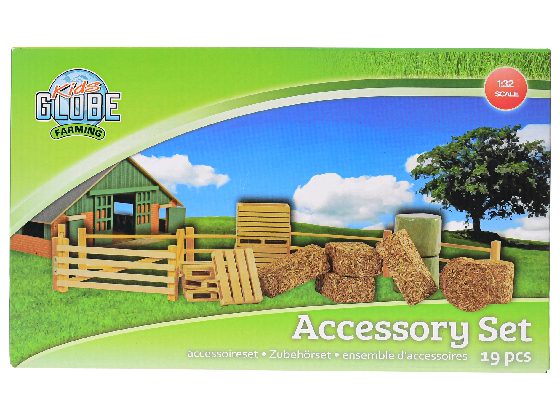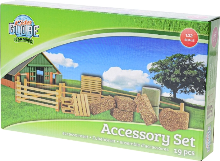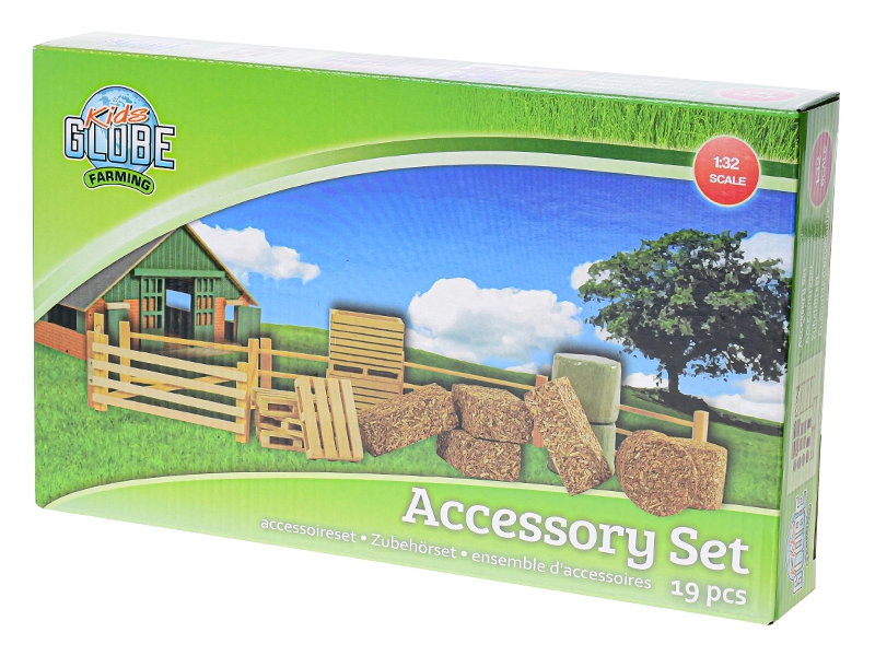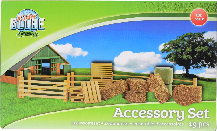 Vsebina paketa vključuje seno, ograjne dele, krmilnike in palete, tako da lahko zlahka postavite ograde, nahranite živali in shranite krmo. Dodatki so združljivi z večino kmetij in traktorjev v merilu 1:32.