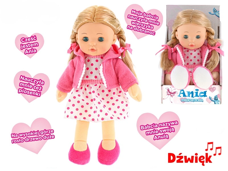 Punčka Ania je zasnovana za najmlajše, ki bodo cenili njeno prijetno mehko telesce in realistične podrobnosti. Zahvaljujoč poljsko govorečim frazam in zvokom na igriv način spodbuja razvoj jezikovnega zaznavanja in socialnih veščin. Mežikajoče oči in modna oblačila še okrepijo realistični doživljaj igre.