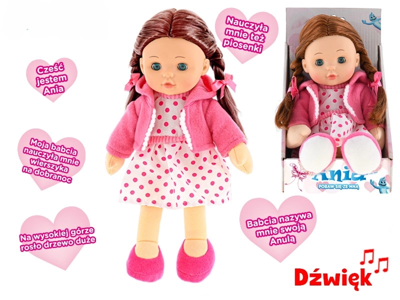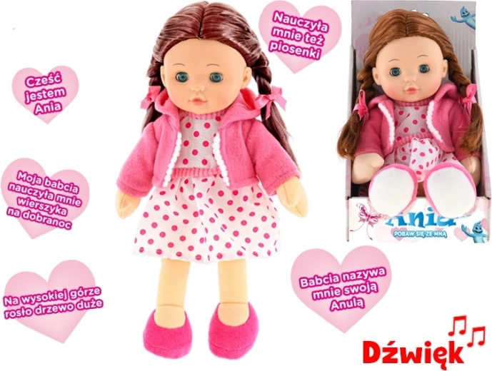 Ljubka interaktivna punčka Ania bo otroke navdušila z realističnim videzom in funkcijami. Ima mehko telesce, pomežikajoče oči in govori poljsko, s čimer spodbuja razvoj jezikovnih spretnosti in interaktivno igro. V pakiranju so priložene tudi baterije AG13, zato je pripravljena za uporabo takoj po odprtju.