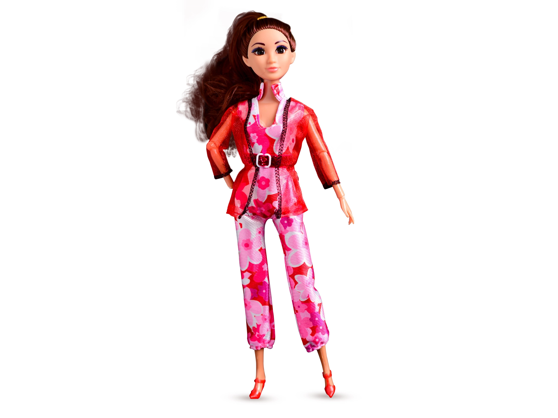 Rožnat pajac s cvetličnim vzorcem, lahko sako s pasom in rdeči salonarji poudarijo edinstven slog Jasmine.