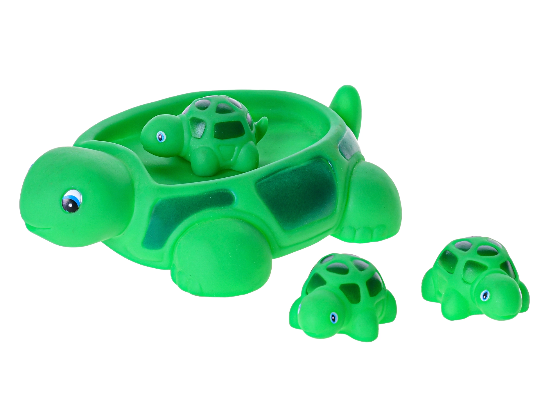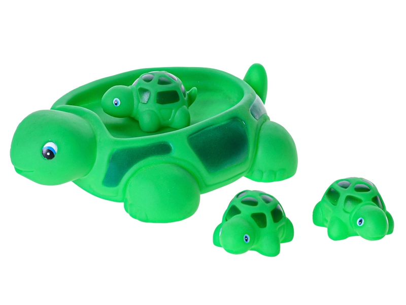 Ta prikupen komplet kopalnih igrač prinaša otrokom veliko veselja pri vsakem kopanju. Velika zelena želva lahko služi kot ladjica ali posodica, njene tri majhne želve pa lahko posadite na oklep, pustite prosto plavati ali stiskate za vadbo fine motorike. Mehak, prijeten plastika je nežen do otroških dlani, gladke oblike z ljubkimi očkami pa spodbujajo interaktivno igro v vodi.