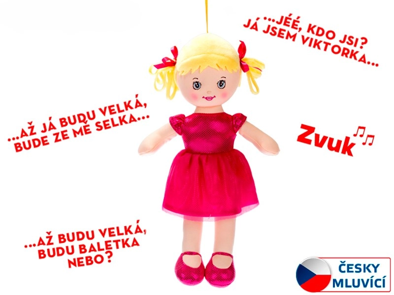 Prisrčna mehka punčka iz blaga Viktorka v temno rožnatih oblekicah razveseli vsakega dojenčka in malčka. Zna govoriti in peti priljubljeno otroško pesmico, je prijetna na dotik in se zaradi velikosti 32 cm odlično prilega tudi najmanjšim ročicam. Primerno od rojstva.
