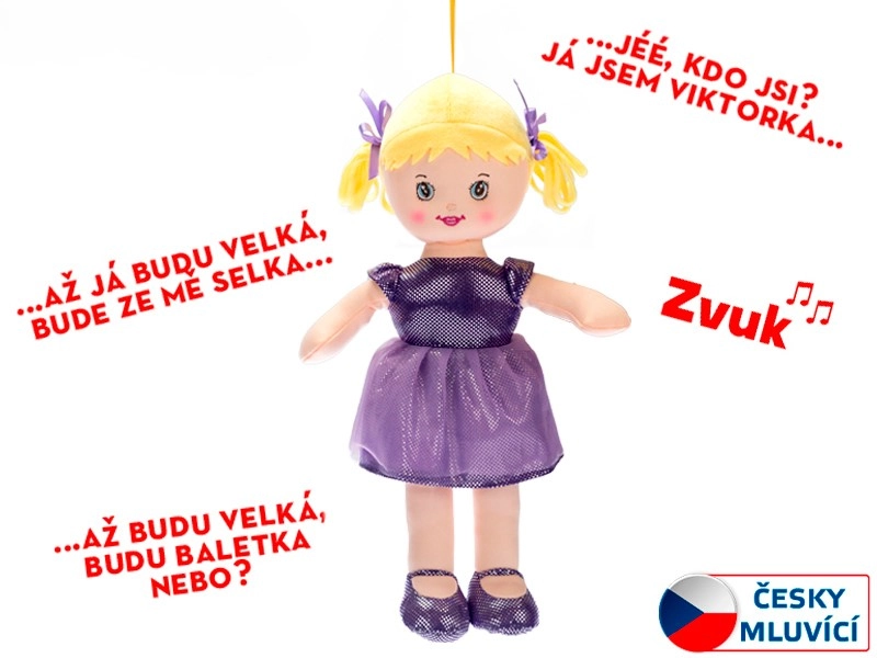 Ljubka plišasta punčka Viktorka v čudoviti vijolični oblekici razveseli vsakega dojenčka in malčka. Je prijetno mehka, lahka za v rokico in zna v češčini govoriti in peti priljubljeno pesmico. Zahvaljujoč velikosti 32 cm je idealna za crkljanje in prve igre ter je primerna od rojstva.