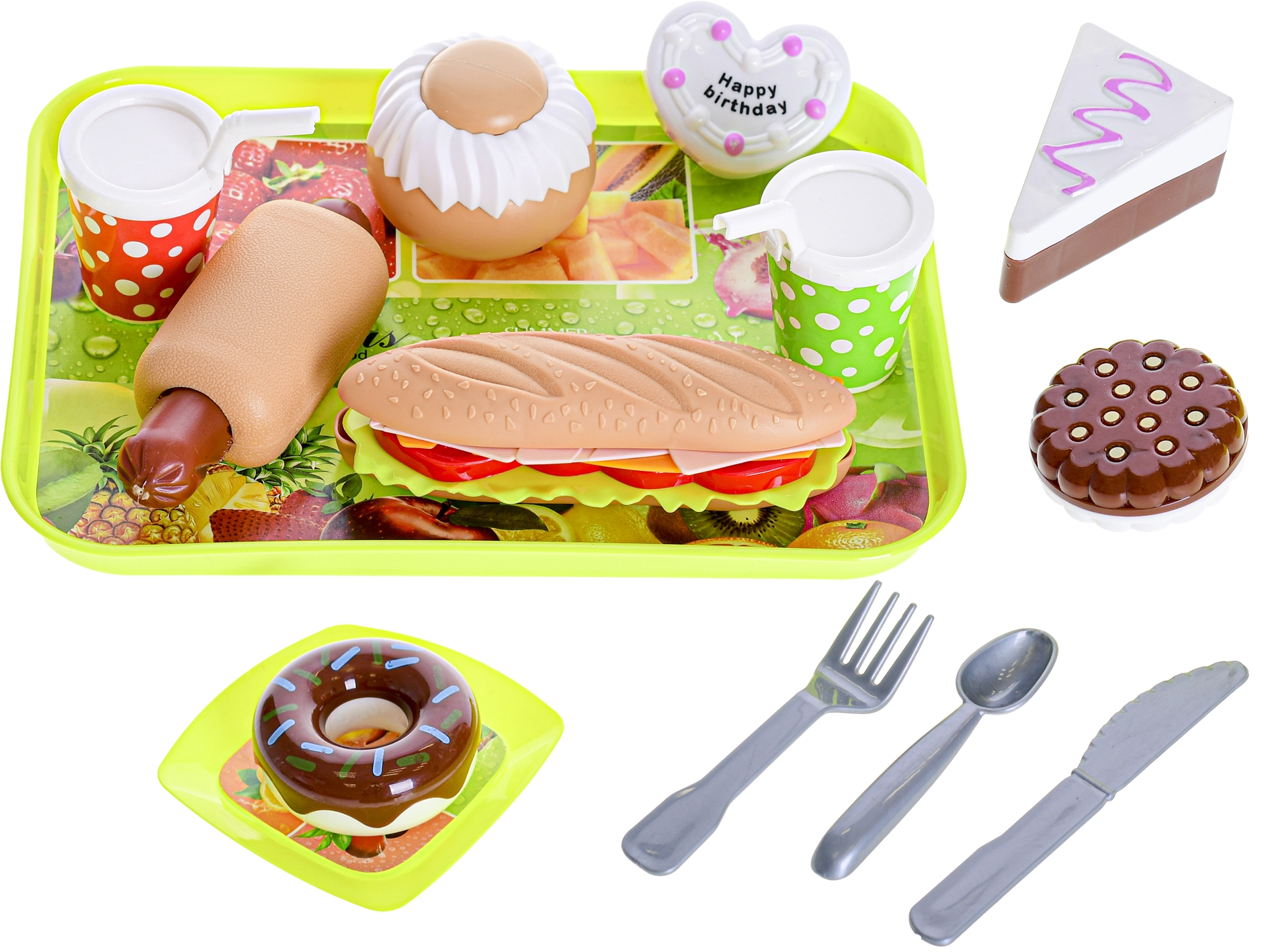S tem realistično zasnovanim kompletom hitre prehrane si otroci ustvarijo svoj meni in ga postrežejo prijateljem ali družini. Vsak del je oblikovan tako, da spodbuja domišljijo in podpira igranje vlog v kuhinjskem kotičku. Deli so iz trpežne plastike, ki je varna za otroke in enostavna za vzdrževanje.