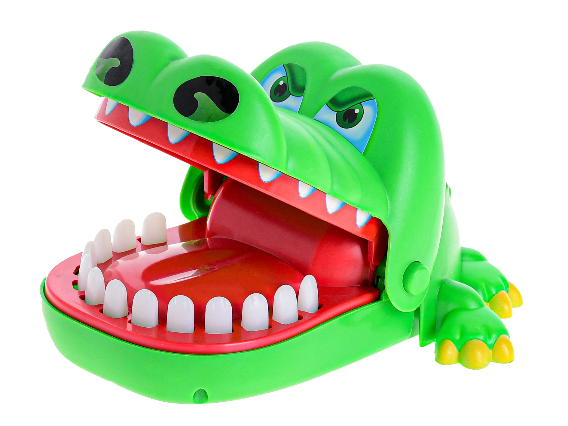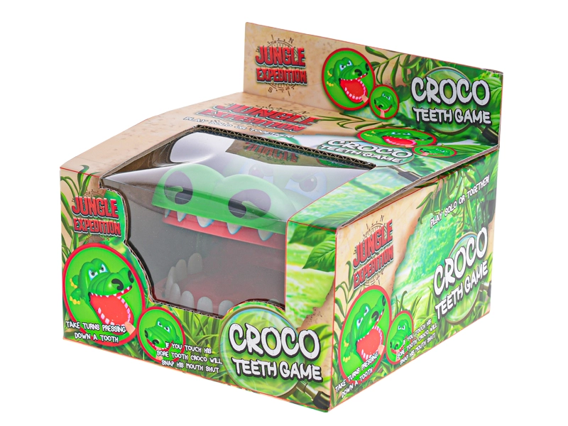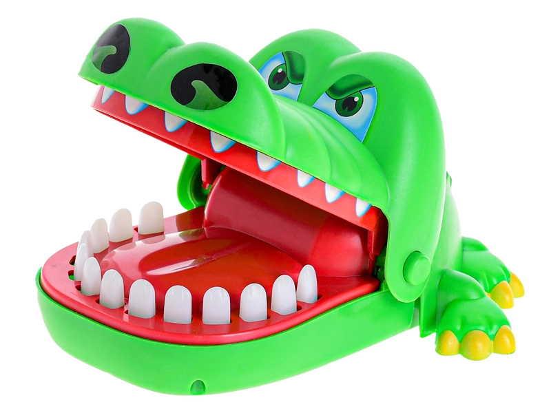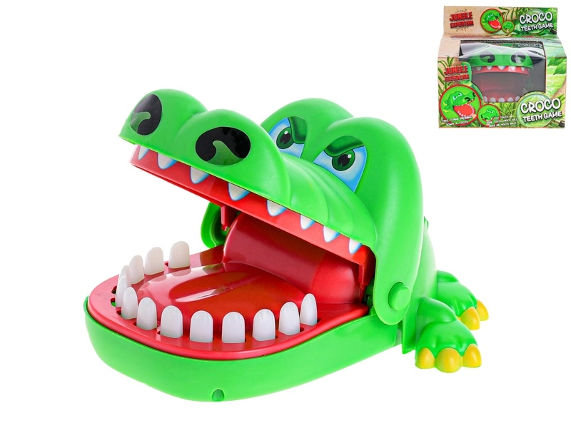 Veseli zeleni krokodil z odprto čeljustjo prinaša napeto akcijo v vsako igro. Igralci si izmenično izbirajo zobe in jih nežno pritisnejo – eden od njih sproži takojšnje klik zapiranje čeljusti, ki preseneti in nasmeji vso družbo.