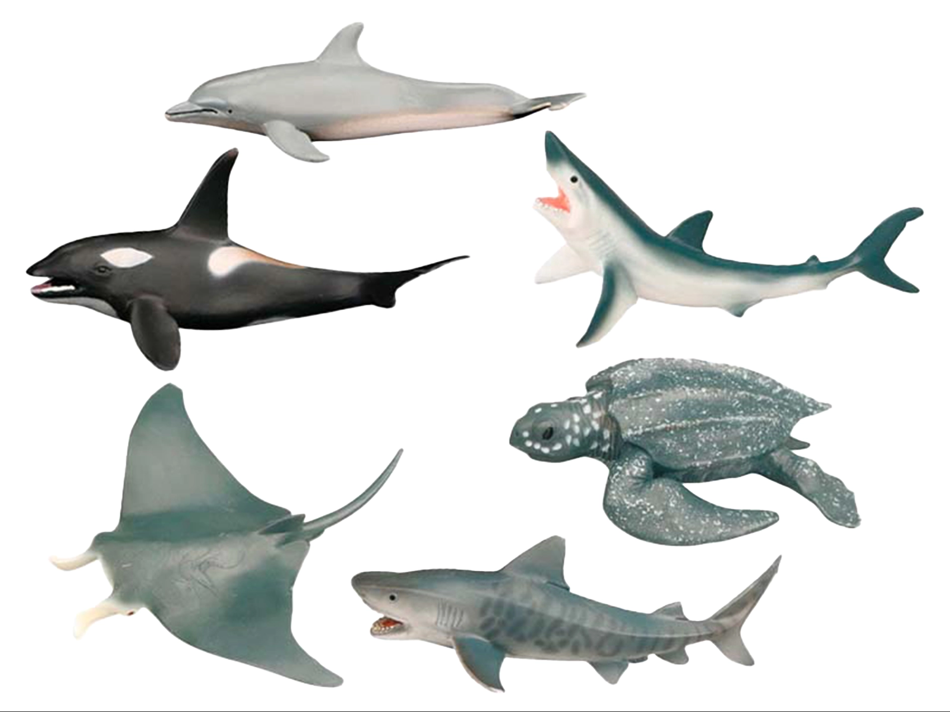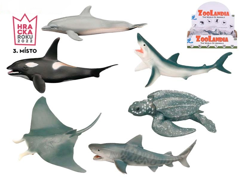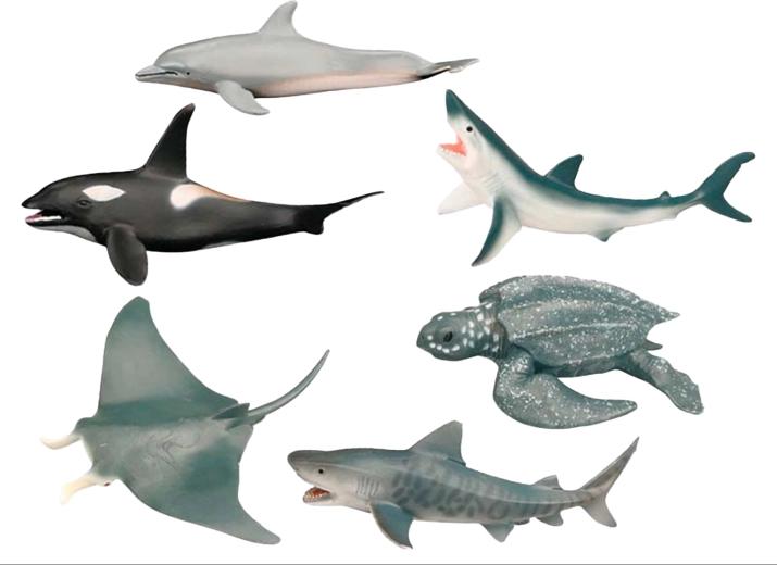 • 6 realistično prikazanih vrst – orka, morski pes, delfin, tigrasti morski pes, mantara in velika kozata.