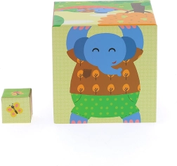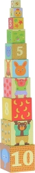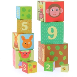 Ta barvit sestavljivi stolp znamke VILAC vsebuje 10 trdnih kartonskih kock z oštevilčenimi ploskvami in ilustracijami živali. Otroci lahko kocke zlagajo v visok stolp ali jih vstavljajo eno v drugo, s čimer naravno urijo štetje, razločevanje velikosti in ravnotežje.