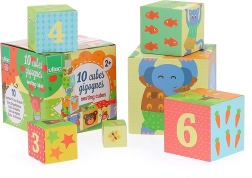 Vsaka kocka nosi številke 1–10, barve in motive živali. Otroci si na igriv način osvojijo štetje ter prepoznavanje oblik in vzorcev.