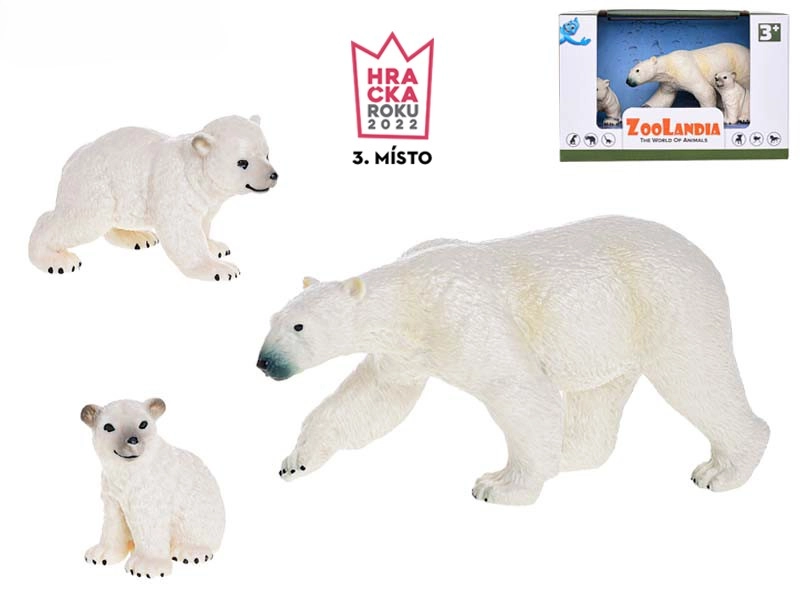 Odrasla polarna medvedka in dva mladiča omogočata ustvarjanje zgodb o družini, skrbi in življenju v ledeni divjini.