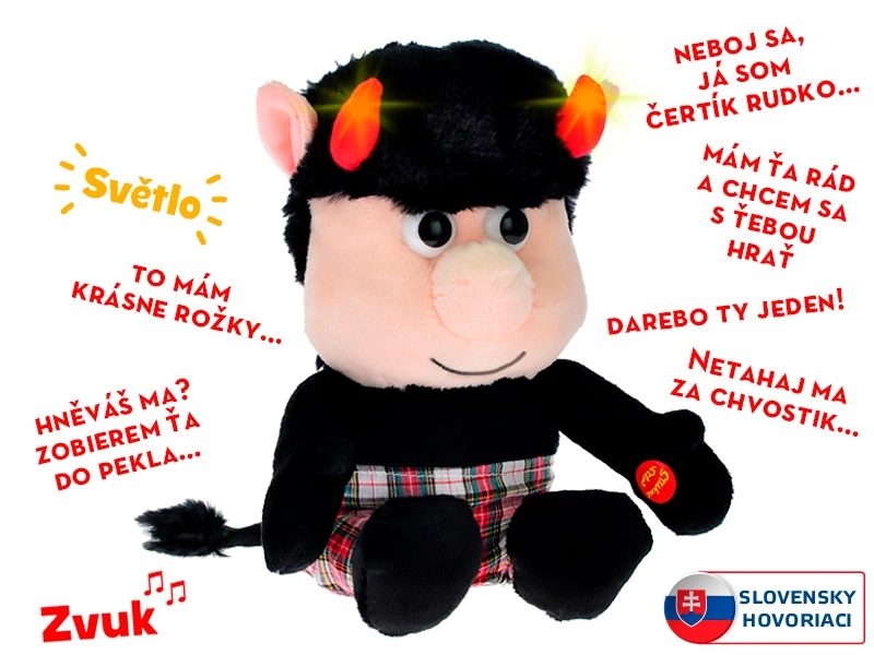 Prisrčni hudiček Rudko bo razveselil male in velike. Izdelan je iz mehkega pliša in vas ob pritisku na roko zabava s slovenskimi frazami, medtem ko mu svetleči rogovi utripajo. Kompaktna višina 20 cm je idealna za crkljanje in igro, baterija pa je priložena.