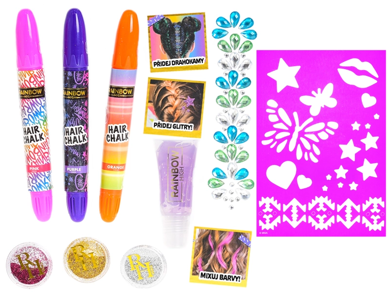 Polepšajte vsak dan s kreativnim kompletom RAINBOW HIGH! Ta dekorativni komplet za lase prinaša preproste in zabavne možnosti oblikovanja za male modne navdušenke. Vsebuje krede za lase, kamenčke, šablone, gel in bleščice za hitro preobrazbo pričeske brez trajnih sprememb – idealno kot darilo za rojstni dan ali drugo posebno priložnost.