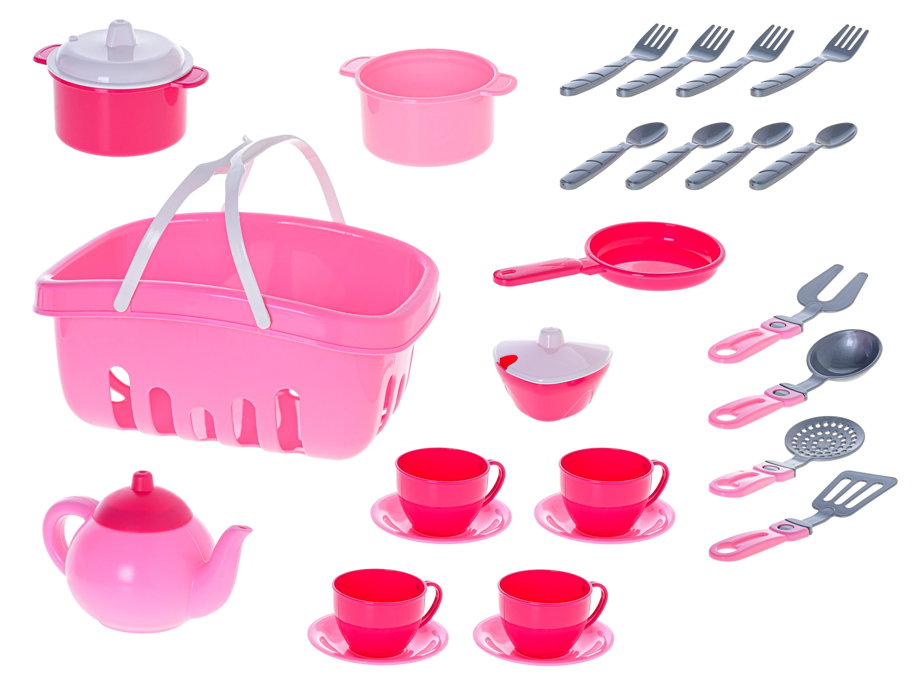 Ta celovit otroški set vsebuje čajnik, lonce s pokrovi, ponev, posodico za sladkor, štiri skodelice s krožnički, jedilni pribor in kuhinjske pripomočke – vse v priročni košari za enostavno shranjevanje. Primeren za igro kuharja, postrežbo in družabne igre, ki spodbujajo igro vlog, komunikacijo in motoriko.