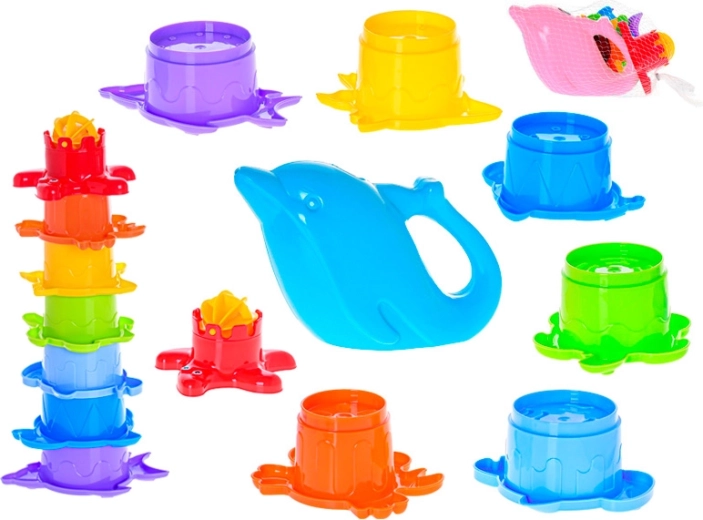 Ta pisani komplet bo navdušil male raziskovalce sveta peska in vode. Stabilna piramida z zabavnimi morskimi motivi ima 7 nadstropij, ki jih je mogoče zložiti eno na drugo in omogočajo sipanje peska ali prelivanje vode ter opazovanje pretoka in vrtenja. Del kompleta je tudi prisrčna zalivalka v obliki delfina, s katero je zalivanje peščenih tortic ali vrtenje turbin še zabavnejše.