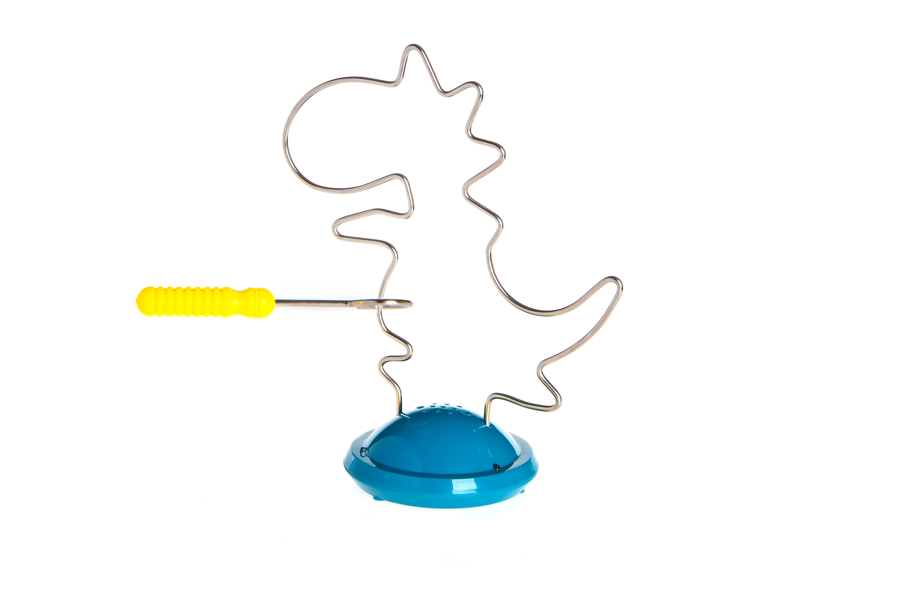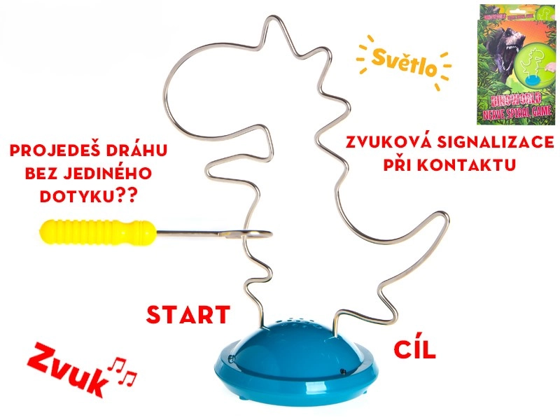 Interaktivna uganka v obliki dinozavra združuje zabavo in učenje: naloga je voditi kovinsko zanko po progi brez dotika. Ob stiku se sproži zvočni signal, ki spodbuja k večji natančnosti. Igra podpira koordinacijo oko–roka, razvija fino motoriko in zahvaljujoč svetlobnim in zvočnim učinkom otroke vabi k ponavljajoči igri. Odporna izvedba iz plastike in kovine, primerna za otroke od 3 let.