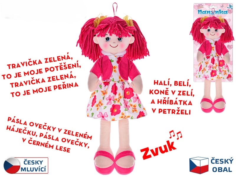 Plišasta punčka Nanynka očara otroke z nežnim videzom in mehkim telesom. Zaradi višine 50 cm jo je enostavno držati, crkljati in spremlja otroke pri igri in uspavanju. Ob pritisku na trebušček Nanynka poje priljubljene češke pesmi (npr. »Halí, belí…«, »Travička zelená…«, »Pásla ovečky…«) ter recitira, s čimer podpira razvoj slušnega zaznavanja, ritma in govorne spretnosti.