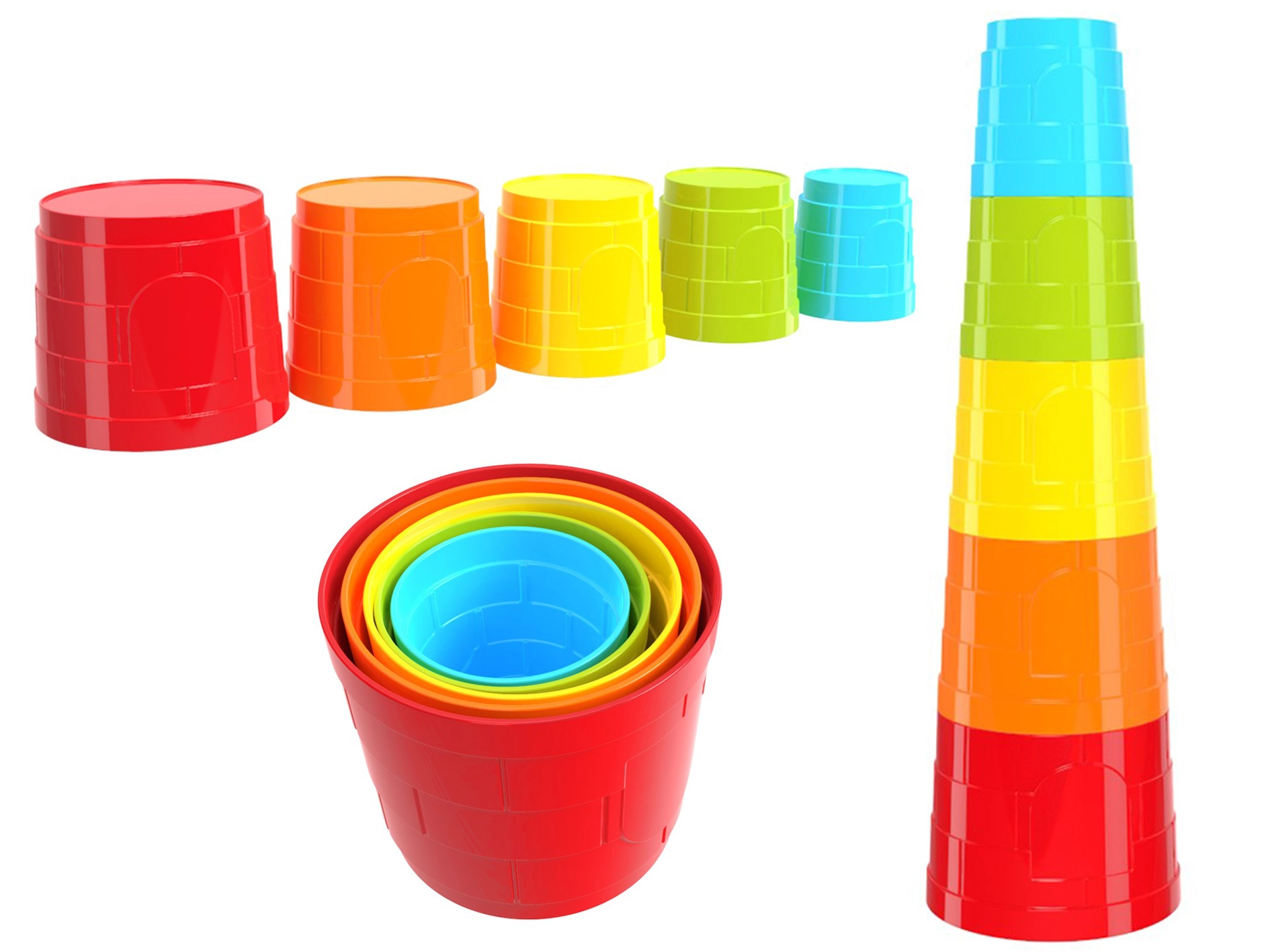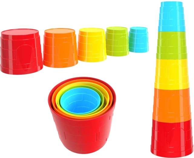 Odkrijte zabavno in poučno igračo za najmlajše: zložljive posodice v pisanih barvah. Komplet petih posodic se zlahka zlagajo ena v drugo ali ena na drugo in tvorijo stolp, ki spominja na grad z okni. Igrača spodbuja fino motoriko, koordinacijo rok in oči, logično razmišljanje ter učenje barv. Zaradi trpežne plastike je primerna tudi za vodo, zato je odlična za igro v kadi in na suhem.
