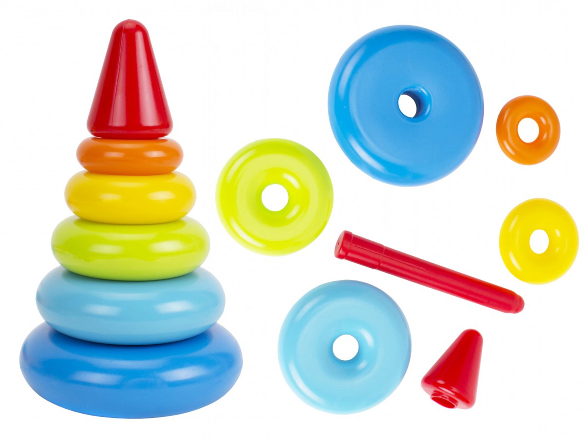 Ta barvita piramida otrokom od 12 mesecev ponuja zabavno obliko učenja. Šest kolutov različnih velikosti se natika na stožec, postavljen na stabilnem podstavku, kar podpira razvoj motoričnih spretnosti, vizualno stimulacijo in razumevanje velikosti in zaporedja.