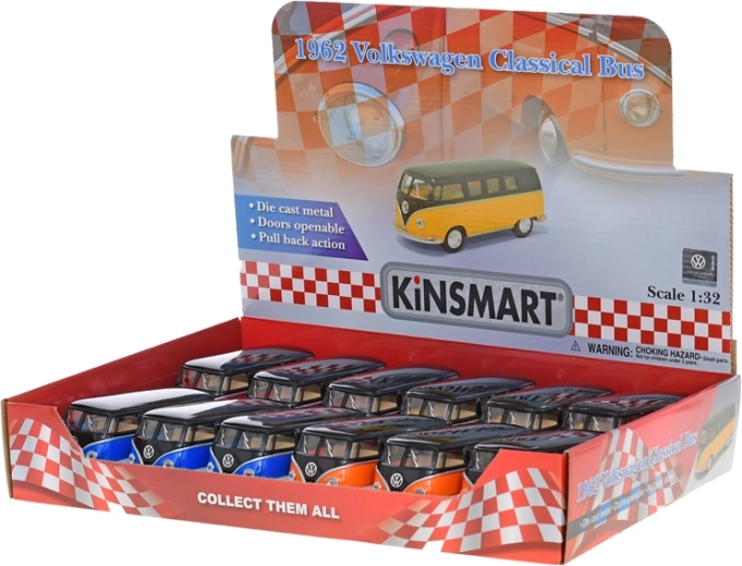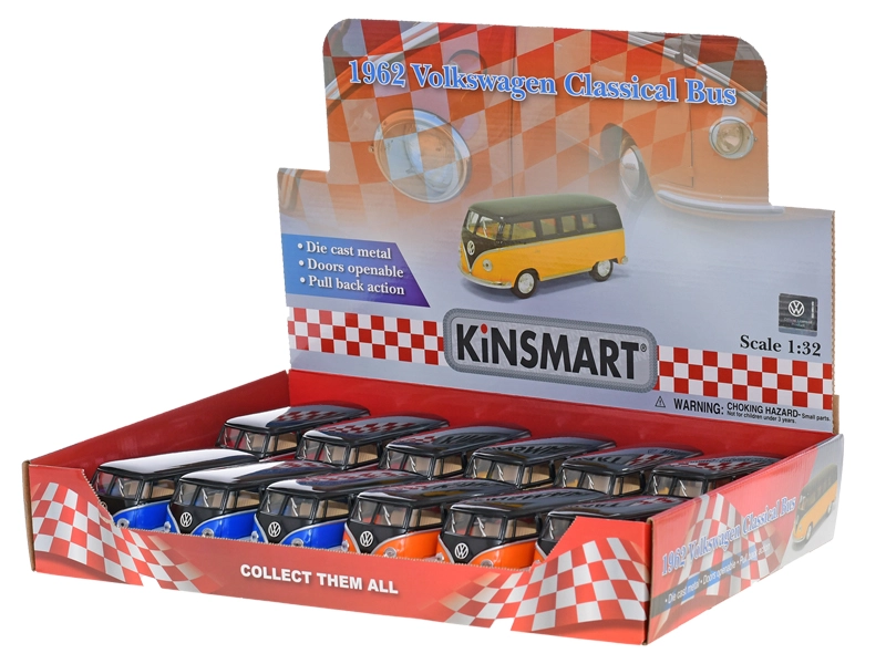 Podrobno izdelan kovinski model avtobusa Volkswagen Classical 1962 v merilu 1:32 bo razveselil zbiratelje in otroke. Ponuja avtentičen videz, odpirajoča se vrata ter zabaven vzmetni pogon (pull-back) za vožnjo naprej po potegu nazaj. Z dolžino 13 cm in v štirih barvnih različicah je trpežen zahvaljujoč kombinaciji kovine in plastike ter primeren za otroke od 3 let.