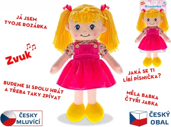 Spoznajte punčko Rozárko – nežno svetlolasko v lepih oblačilcih in s kitkami. Zaradi mehkega telescа je prijetna na dotik in se odlično prilega otroškemu objemu. Govori češko, zato otroci naravno razvijajo besedišče in komunikacijske veščine pri vsakodnevni igri.