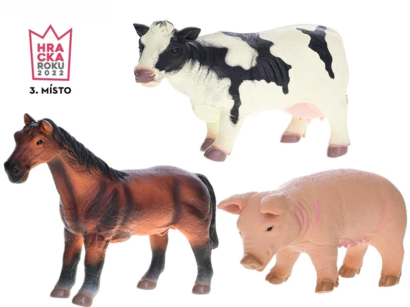V pakiranju najdete 3 domače živali – konja, kravo in prašiča. Trpežna plastika prenese vsakodnevno igro doma in na poti ter je enostavna za čiščenje. Ta komplet je odličen dodatek za male ljubitelje živali in odlična osnova za gradnjo lastne kmetije.