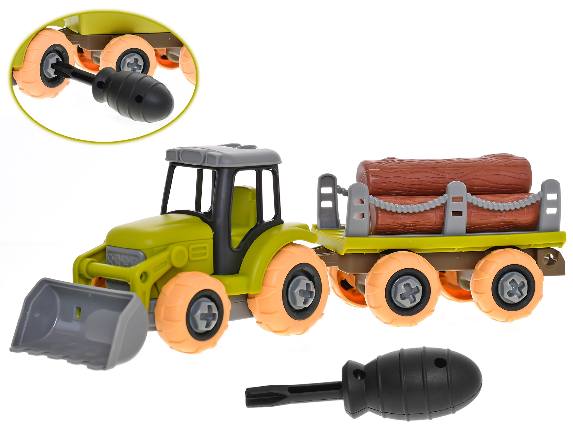 Odkrijte zabavno igračo za male kmete: vijačni traktor s prikolico in hlodi dolžine 28 cm. Zahvaljujoč vijačnemu mehanizmu si lahko otroci vozilo sami sestavijo in razstavijo, kar razvija fino motoriko in tehnične veščine. Prosti tek zagotavlja gladko in tiho gibanje po tleh, vzdržljiv plastični material pa obljublja dolgo življenjsko dobo.