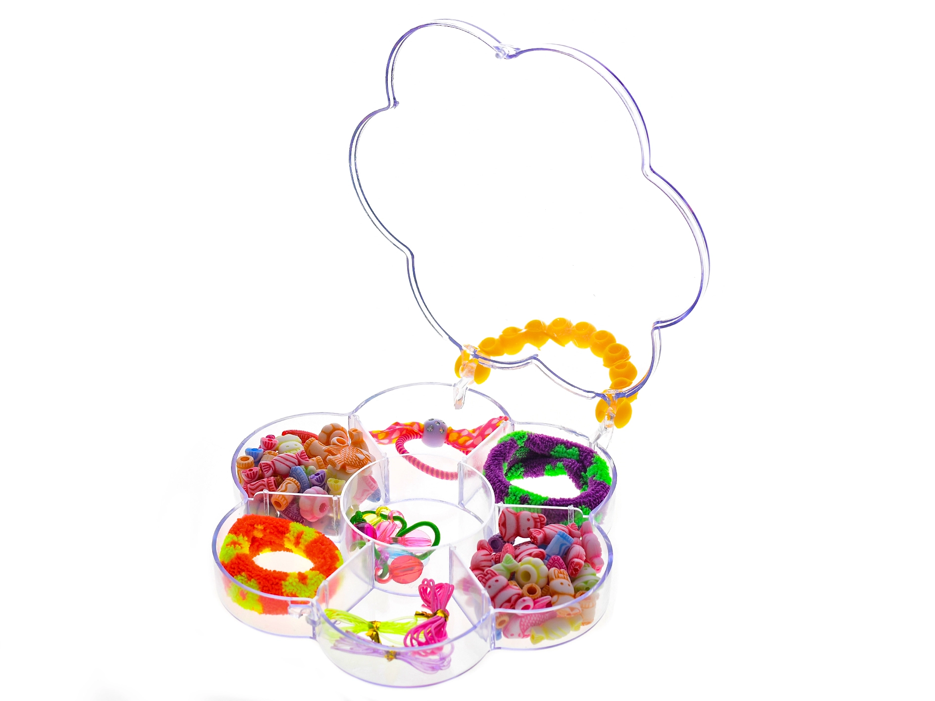 Ta igrivi komplet je idealen za male modne navdušenke, ki imajo rade izvirne pričeske in ustvarjanje lastnih lasnih okraskov. Zahvaljujoč pisani paleti oblik in barv lahko otroci kombinirajo kroglice in dodatke ter ustvarjajo edinstvene stile po svoji domišljiji. Vse je shranjeno v pregledni škatlici, ki olajša shranjevanje in prenašanje.