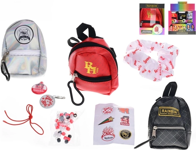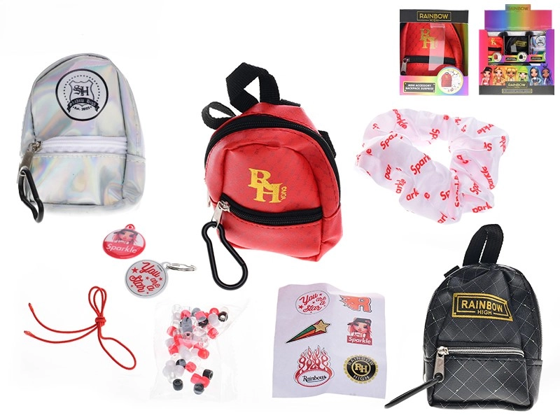- mini nahrbtnik, elastika za lase, pisane perlice, obeski z logotipom RAINBOW HIGH