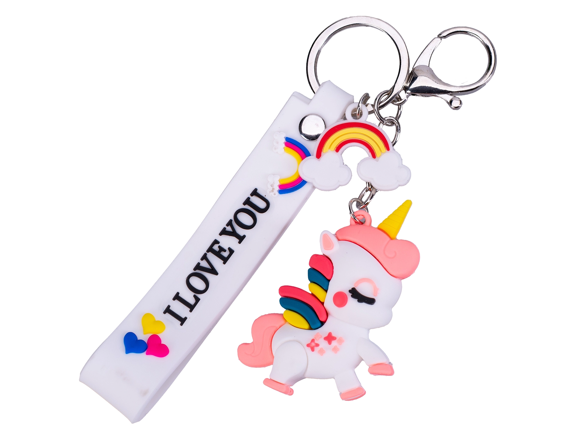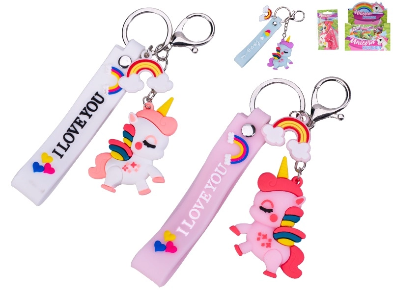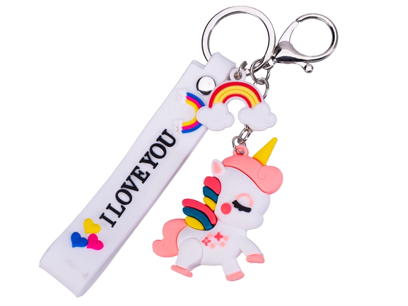 Prisrčen obesek za ključe z motivom samoroga razveseli otroke in odrasle. Ponuja žive barve, mehak silikonski pašček z napisom I LOVE YOU in vzdržljive kovinske obročke za enostavno pripenjanje na ključe ali torbo. Lahek, a hkrati trpežen dodatek v rožnati, modri in beli različici.